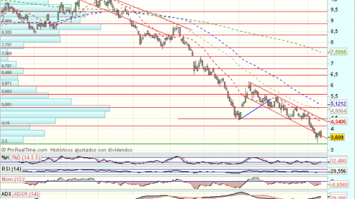 En el largo plazo, Arcelor, desde que formara un doble techo en los 34,5 euros, mantiene una fuerte tendencia bajista, que deriva en un rango lateral, con suelo en el soporte de los 8,35 euros.