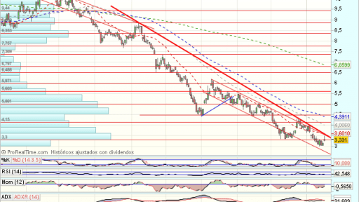En el largo plazo, Arcelor, desde que formara un doble techo en los 34,5 euros, mantiene una fuerte tendencia bajista, que deriva en un rango lateral, con suelo en el soporte de los 8,35 euros.