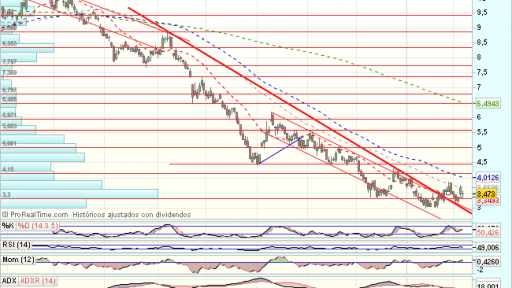 En el largo plazo, Arcelor, desde que formara un doble techo en los 34,5 euros, mantiene una fuerte tendencia bajista, que deriva en un rango lateral, con suelo en el soporte de los 8,35 euros.
