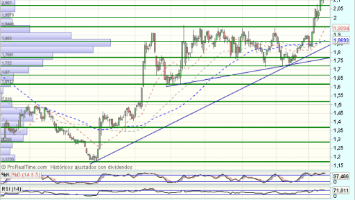 La tendencia de largo plazo de Banco de Sabadell sigue muy bajista, aunque en el medio plazo, tras encontrar apoyos en forma de doble suelo en los 1,175 euros, define una tendencia alcista, que supera la media de 200 sesiones, hasta encontrar techo en los 1,95 euros, que fuerzan una extensa consolidación lateral, con base en los 1,72 euros.
