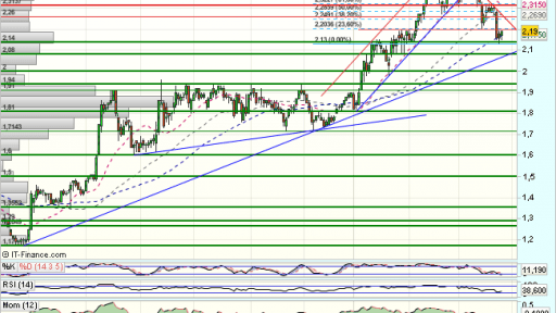 En el corto plazo, se apoya en la base del rango para un nuevo impulso alcista, que supera el techo del rango definiendolo como de continuidad alcista, y el 100% de todo el impulso bajista previo desde agosto de 2012, hasta los 2,44 euros, que fuerzan una consolidacion.
