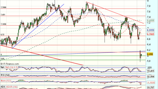 Tras consolidar, se apoya en la media de 200 sesiones para un nuevo impulso alcista acelerado, que supera máximos de impulso previos y la media de 200 sesiones tanto en diario como en semanal. Encuentra obstáculos en los 6,7, euros, que fuerzan una consolidacion.
