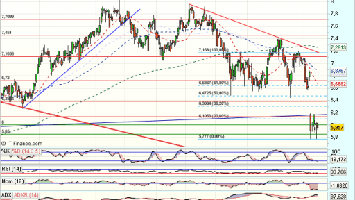 Tras consolidar, se apoya en la media de 200 sesiones para un nuevo impulso alcista acelerado, que supera máximos de impulso previos y la media de 200 sesiones tanto en diario como en semanal. Encuentra obstáculos en los 6,7, euros, que fuerzan una consolidacion.