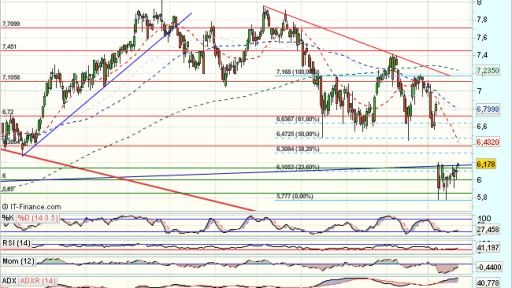 Tras consolidar, se apoya en la media de 200 sesiones para un nuevo impulso alcista acelerado, que supera máximos de impulso previos y la media de 200 sesiones tanto en diario como en semanal. Encuentra obstáculos en los 6,7, euros, que fuerzan una consolidacion.