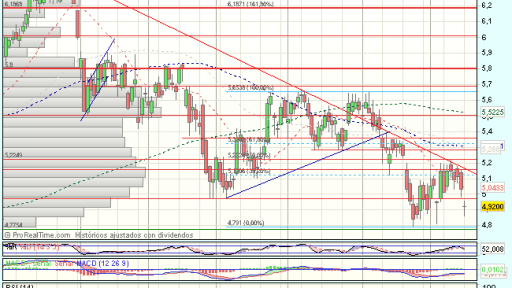 En el corto plazo, el Banco de Santander, tras encontrar apoyos en el soporte de los 5 euros, intenta un nuevo impulso alcista que deriva en un movimiento lateral, y nos deja una figura de triple techo en los 5,65 euros.