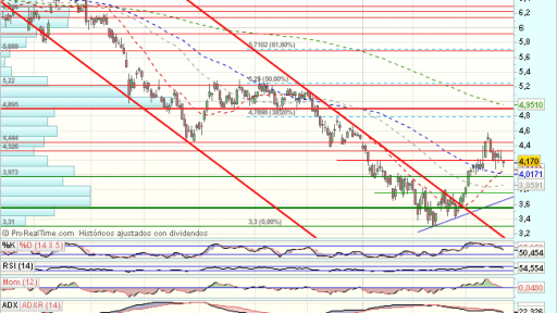 En el largo plazo, el Banco de Santander, tras encontrar apoyos en el soporte de los 3,5 euros, inicia un nuevo impulso alcista, que se agota en los 8,27 euros.
