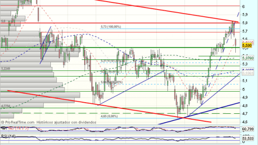 El Banco de Santander tras realizar un doble apoyo en los 3,7 euros, ha mantenido una fuerte tendencia alcista, que se ve bruscamente frenada en los 6,2 euros, forzando un fuerte impulso bajista, hasta los 4,65 euros.