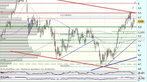 El Banco de Santander tras realizar un doble apoyo en los 3,7 euros, ha mantenido una fuerte tendencia alcista, que se ve bruscamente frenada en los 6,2 euros, forzando un fuerte impulso bajista, hasta los 4,65 euros.