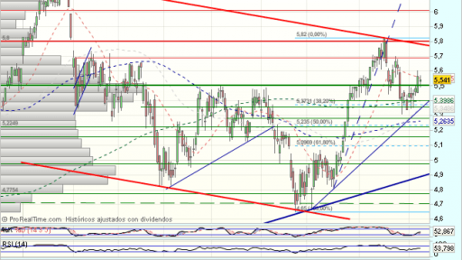 El Banco de Santander tras realizar un doble apoyo en los 3,7 euros, ha mantenido una fuerte tendencia alcista, que se ve bruscamente frenada en los 6,2 euros, forzando un fuerte impulso bajista, hasta los 4,65 euros.