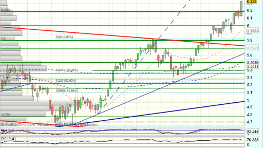 El Banco de Santander, tras encontrar apoyos en el soporte de los 4,65 euros, inicia un nuevo impulso alcista, que se agota ante la resistencia semanal de los 5,8 euros y techo del canal bajista, que fuerza un nuevo impulso bajista, hasta los 5,3 euros, desde donde se impulsa al alza.