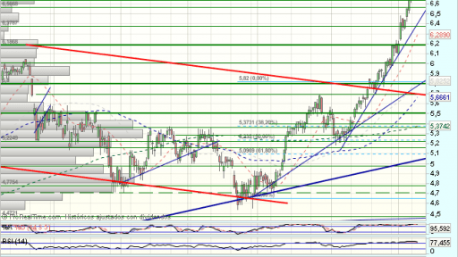 En el medio – largo plazo, el Banco de Santander, tras encontrar apoyos en el soporte de los 4,65 euros, inicia un nuevo impulso alcista, que se agota ante la resistencia semanal de los 5,8 euros y techo del canal bajista, que fuerzan un nuevo impulso bajista, hasta los 5,3 euros, desde donde se impulsa nuevamente al alza.