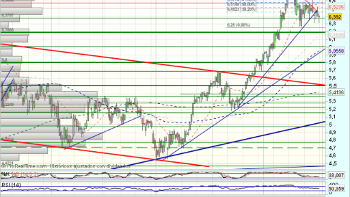 Tras consolidar, se apoya en la media de 200 sesiones para un nuevo impulso alcista acelerado, que supera los máximos de impulso previos e importantes resistencias de largo plazo, como son la mensual de los 5,8 euros y el techo del canal bajista y la media de 200 semanal.