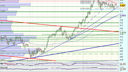 En el medio – largo plazo, el Banco de Santander, tras encontrar apoyos en el soporte de los 4,5 euros, inicia un nuevo impulso alcista, que se agota en los 5,69 euros.