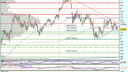 El Banco de Santander tras realizar un doble apoyo en los 3,7 euros, ha mantenido una fuerte tendencia alcista, hasta alcanzar resistencias en los 6,4 euros, que fuerzan un fuerte impulso bajista, que perfora soportes y media de 200 sesiones.