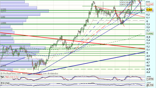 En el medio – largo plazo, el Banco de Santander, tras encontrar apoyos en el soporte de los 4,5 euros, inicia un nuevo impulso alcista, que se agota en los 5,69 euros.