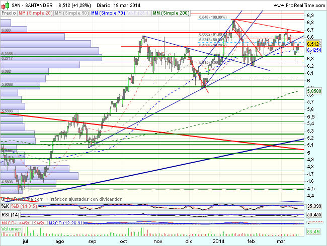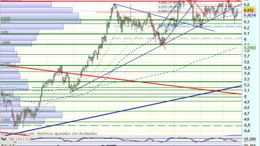 Tras consolidar, se apoya en la media de 200 sesiones para un nuevo impulso alcista acelerado, que supera máximos de impulso previos y la media de 200 sesiones tanto en diario como en semanal. Encuentra obstáculos en los 6,85, euros, que fuerzan una consolidacion.