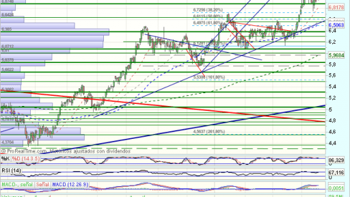 Tras consolidar, se apoya en la media de 200 sesiones para un nuevo impulso alcista acelerado, que supera máximos de impulso previos y la media de 200 sesiones tanto en diario como en semanal. Encuentra obstáculos en los 6,85, euros, que fuerzan una consolidacion.