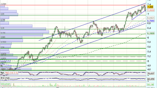 Tras consolidar, se apoya en la media de 200 sesiones para un nuevo impulso alcista acelerado, que supera máximos de impulso previos y la media de 200 sesiones tanto en diario como en semanal. Encuentra obstáculos en los 6,5, euros, que fuerzan una consolidacion.