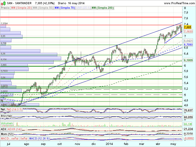 En el medio – largo plazo, el Banco de Santander, tras encontrar apoyos en el soporte de los 4,5 euros, inicia un nuevo impulso alcista, que se agota en los 5,8 euros.