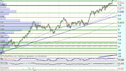Tras consolidar, se apoya en la media de 200 sesiones para un nuevo impulso alcista acelerado, que supera máximos de impulso previos y la media de 200 sesiones tanto en diario como en semanal. Encuentra obstáculos en los 6,5, euros, que fuerzan una consolidacion.