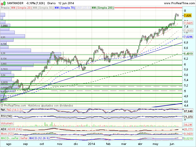 En el medio – largo plazo, el Banco de Santander, tras encontrar apoyos en el soporte de los 4,5 euros, inicia un nuevo impulso alcista, que se agota en los 5,8 euros.