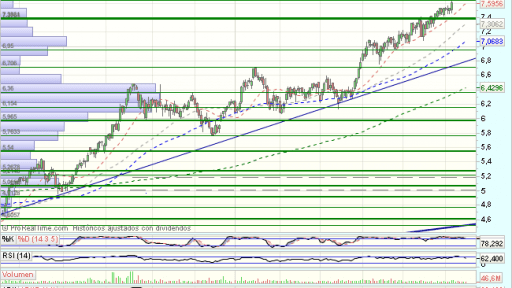 Tras consolidar, se apoya en la media de 200 sesiones para un nuevo impulso alcista acelerado, que supera máximos de impulso previos y la media de 200 sesiones tanto en diario como en semanal. Encuentra obstáculos en los 6,5, euros, que fuerzan una consolidacion.