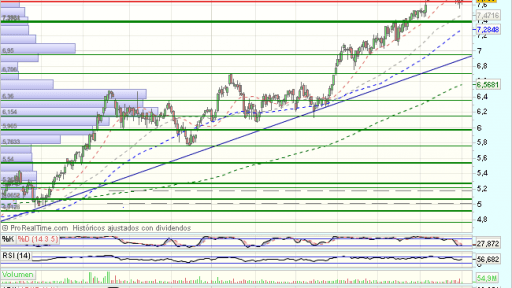 Tras consolidar, se apoya en la media de 200 sesiones para un nuevo impulso alcista acelerado, que supera máximos de impulso previos y la media de 200 sesiones tanto en diario como en semanal. Encuentra obstáculos en los 6,7, euros, que fuerzan una consolidacion.
