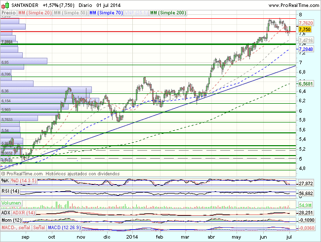 En el medio – largo plazo, el Banco de Santander, tras encontrar apoyos en el soporte de los 4,5 euros, inicia un nuevo impulso alcista, que se agota en los 5,8 euros
