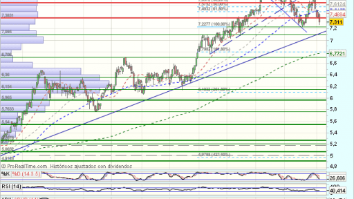 Tras consolidar, se apoya en la media de 200 sesiones para un nuevo impulso alcista acelerado, que supera máximos de impulso previos y la media de 200 sesiones tanto en diario como en semanal. Encuentra obstáculos en los 6,7, euros, que fuerzan una consolidacion.