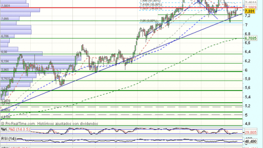 Tras consolidar, se apoya en la media de 200 sesiones para un nuevo impulso alcista acelerado, que supera máximos de impulso previos y la media de 200 sesiones tanto en diario como en semanal. Encuentra obstáculos en los 6,7, euros, que fuerzan una consolidacion.