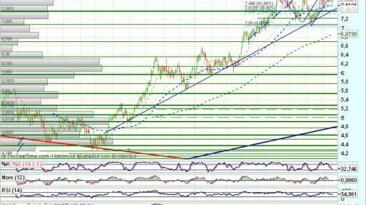 Tras consolidar, se apoya en la media de 200 sesiones para un nuevo impulso alcista acelerado, que supera máximos de impulso previos y la media de 200 sesiones tanto en diario como en semanal. Encuentra obstáculos en los 6,7, euros, que fuerzan una consolidacion.