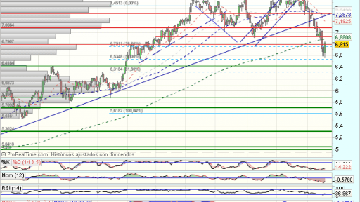 Tras consolidar, se apoya en la media de 200 sesiones para un nuevo impulso alcista acelerado, que supera máximos de impulso previos y la media de 200 sesiones tanto en diario como en semanal. Encuentra obstáculos en los 6,7, euros, que fuerzan una consolidacion.