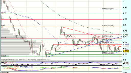 El Banco Popular, se mantiene volátil en la sesión de hoy, y cotiza plano en los 0,579 euros, prácticamente sobre el soporte de los 5,75 euros, ultimo antes de mínimos.