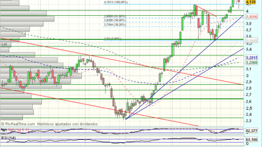 El Banco Popular, se mantiene bajo presión compradora en la sesión de hoy, y cotiza con beneficios del 1,55% en los 4,20 euros, en un nuevo impulso hacia los 4,32 euros.