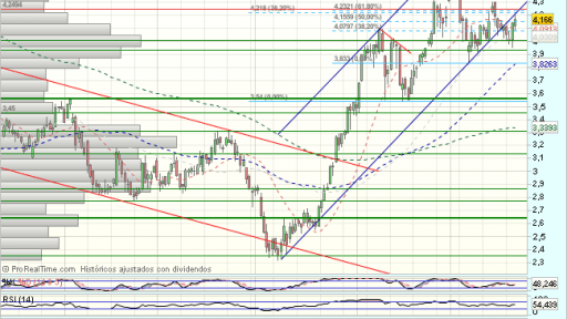 La tendencia del Banco Popular en el largo plazo es muy bajista, si bien, en el corto plazo, tras encontrar apoyos en el soporte de los 2,35 euros, inicia un fuerte movimiento alcista, que va acelerando tendencia, hasta los 4,5 euros, que fuerzan una consolidación.