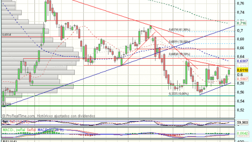 La tendencia del Banco Popular en el largo plazo es muy bajista, si bien, en el corto plazo, tras realizar una formación de doble suelo en el soporte de los 0,528 euros, intenta las alzas, que se han visto frenadas ante la resistencia en los 0,786 euros, dando lugar a un nuevo impulso bajista, que esta encontrando apoyos ante el soporte de los 0,55 euros, dibujando una formación triangular.