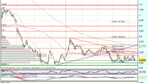La tendencia del Banco Popular en el largo plazo es muy bajista, si bien, en el corto plazo, tras realizar una formación de doble suelo en el soporte de los 0,528 euros, intenta las alzas, que se han visto frenadas ante la resistencia en los 0,786 euros, dando lugar a un nuevo impulso bajista, que esta encontrando apoyos ante el soporte de los 0,55 euros, dibujando una formación lateral.