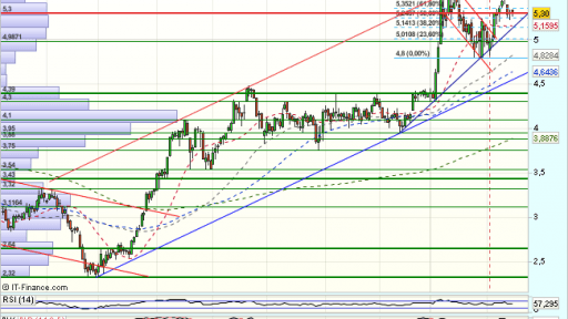 En el medio plazo, encuentra obstáculos en los 4,5 euros, que fuerzan una consolidación, hasta los 3,75, que deriva en una consolidacion lateral, que rompe fuertemente al alza, definiendola como de continuidad alcista, y supera el 100% de todo el impulso bajista previo desde 2012, hasta los 5,68 euros, que fuerzan una consolidación.