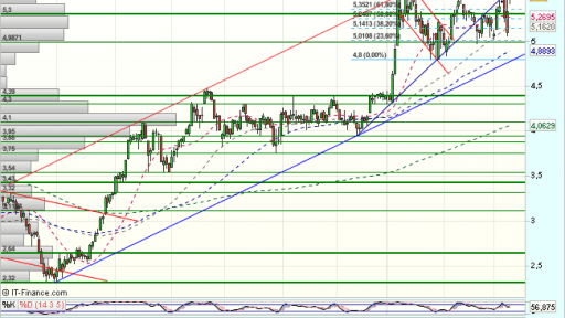 En el medio plazo, encuentra obstáculos en los 4,5 euros, que fuerzan una consolidación, hasta los 3,75, que deriva en una consolidacion lateral, que rompe fuertemente al alza, definiendola como de continuidad alcista, y supera el 100% de todo el impulso bajista previo desde 2012, hasta los 5,68 euros, que fuerzan una consolidación.