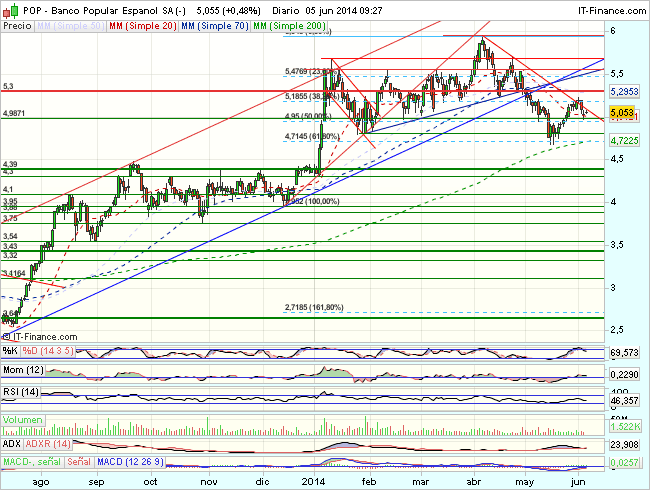 La tendencia del Banco Popular en el largo plazo es muy bajista, si bien, en el medio plazo, tras encontrar apoyos en el soporte de los 2,35 euros, inicia un fuerte movimiento alcista, que va acelerando tendencia, hasta los4,5 euros, que fuerzan una consolidacion lateral.