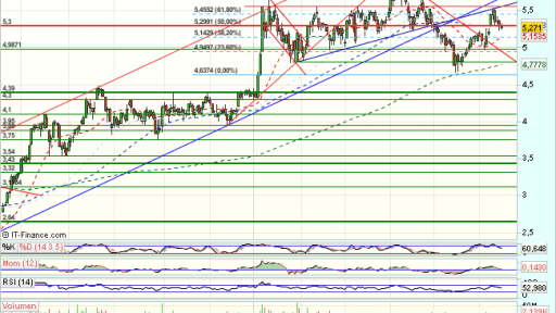 En el medio plazo, rompe fuertemente al alza, definiendo el lateral como de continuidad alcista, y que supera el 100% de todo el impulso bajista previo desde 2012, hasta los 5,95 euros, que fuerzan una consolidación.