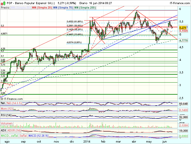La tendencia del Banco Popular en el largo plazo es muy bajista, si bien, en el medio plazo, tras encontrar apoyos en el soporte de los 2,35 euros, inicia un fuerte movimiento alcista, que va acelerando tendencia, hasta los4,5 euros, que fuerzan una consolidacion lateral.