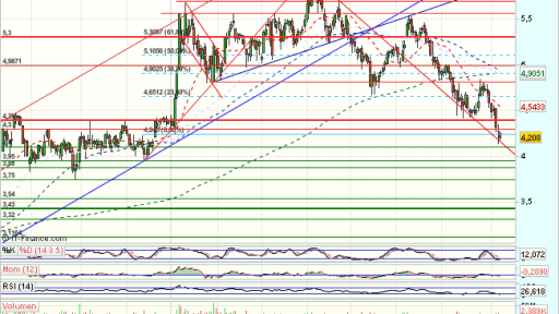 En el medio plazo, rompe fuertemente al alza, definiendo el lateral como de continuidad alcista, y que supera el 100% de todo el impulso bajista previo desde 2012, hasta los 5,95 euros, que fuerzan una consolidación hasta los 4,65 euros y media de 200 sesiones, desde donde se impulsa hasta los 5,5, que fuerzan una consolidación.