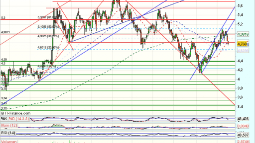 En el medio plazo, rompe fuertemente al alza, definiendo el lateral como de continuidad alcista, y que supera el 100% de todo el impulso bajista previo desde 2012, hasta los 5,95 euros, que fuerzan una consolidación hasta los 4,65 euros y media de 200 sesiones, desde donde se impulsa hasta los 5,5, que fuerzan una consolidación.