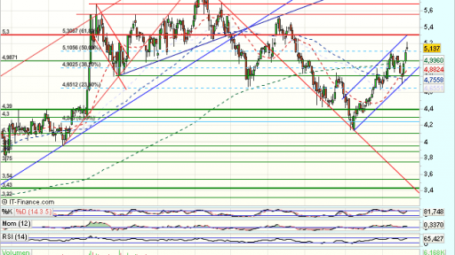 En el medio plazo, rompe fuertemente al alza, definiendo el lateral como de continuidad alcista, y que supera el 100% de todo el impulso bajista previo desde 2012, hasta los 5,95 euros, que fuerzan una consolidación hasta los 4,65 euros y media de 200 sesiones, desde donde se impulsa hasta los 5,5, que fuerzan una consolidación.