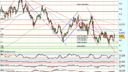 En el medio plazo, rompe fuertemente al alza, definiendo el lateral como de continuidad alcista, y que supera el 100% de todo el impulso bajista previo desde 2012, hasta los 5,95 euros, que fuerzan una consolidación.