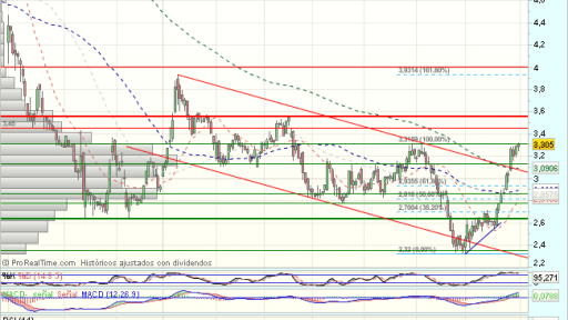 El Banco Popular, se mantiene bajo fuerte presión compradora en la sesión de hoy, y cotiza con beneficios del 2,84% en los 3,3990 euros, superando la resistencia en los 3,31, máximos del impulso previo.