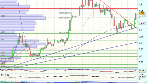En el corto plazo, se impulsa desde el soporte de los 0,67 euros y supera el 100% de recuperación de todo el impulso bajista previo, acelerando tendencia, y anulando la formación de doble techo.