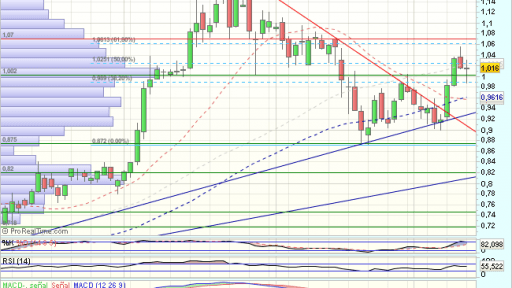 En el corto plazo, se impulsa desde el soporte de los 0,67 euros y supera el 100% de recuperación de todo el impulso bajista previo, acelerando tendencia, y anulando la formación de doble techo.