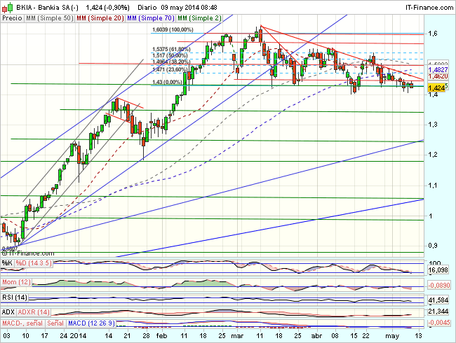 Bankia en el largo plazo, tras una prolongada fase bajista, inicia en el medio plazo, un impulso alcista en los 0,53 euros, que encuentra obstáculos en los 0,88, dejando una formación de doble techo, que da paso a un nuevo impulso bajista.